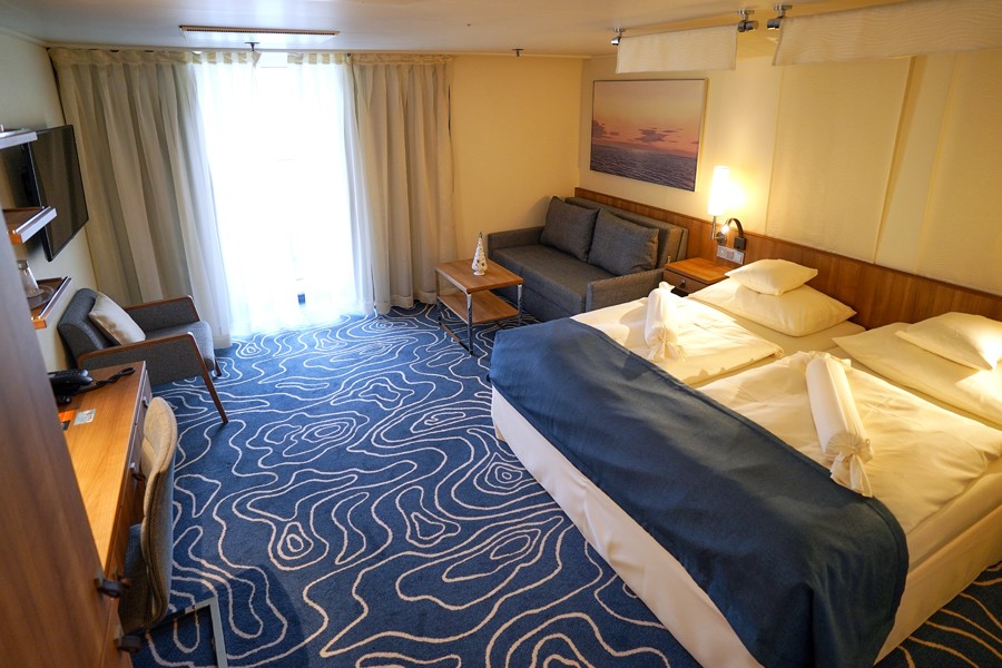 Гости Astoria Grande могут выбрать для проживания Королевский или Джуниор сьют, каюту с балконом, окном или без окна. Для гостей с ограничениями физическими возможностями подготовлены удобные номера (стоимость тура для сопровождающего составляет 50% от тарифа). В номерах: 2- или 1-спальная кровать, сплит-система, гардероб, сейф, ТВ, телефон, фен, халаты, увлажнитель воздуха, ванна (душ) и санузел.