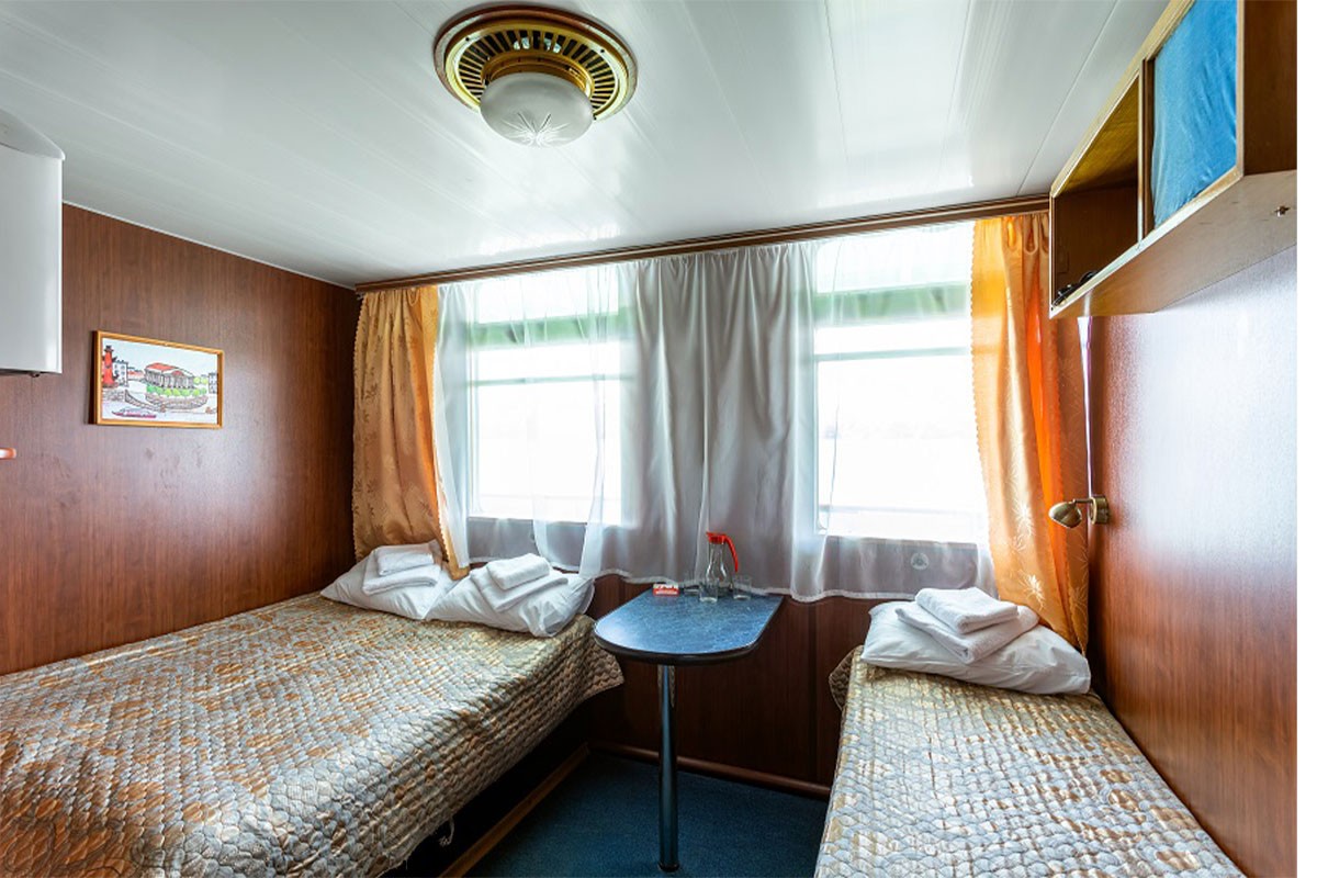 К категории А2 относятся каюты: 102 – 109, 112, 113, 116, 117, 202 – 209, 225, 229, 231, 233 – 242. Двухместная каюта со всеми удобствами, расположенная на главной и средней палубах. В каюте: два односпальных дивана, шкаф, стол, холодильник, ванная комната (раковина, душ, туалет), фен, телевизор, общая система вентиляции, обзорное окно. К навигации 2024 каюты 225, 229, 231, 233 – 242, расположенные на корме средней палубы, были модернизированы и оборудованы ванной комнатой с корабельным душем, общей системой вентиляции, обновлён текстиль и материал стен. Также в каютах сохранились в наличии шкаф, стол, холодильник, фен, телевизор.