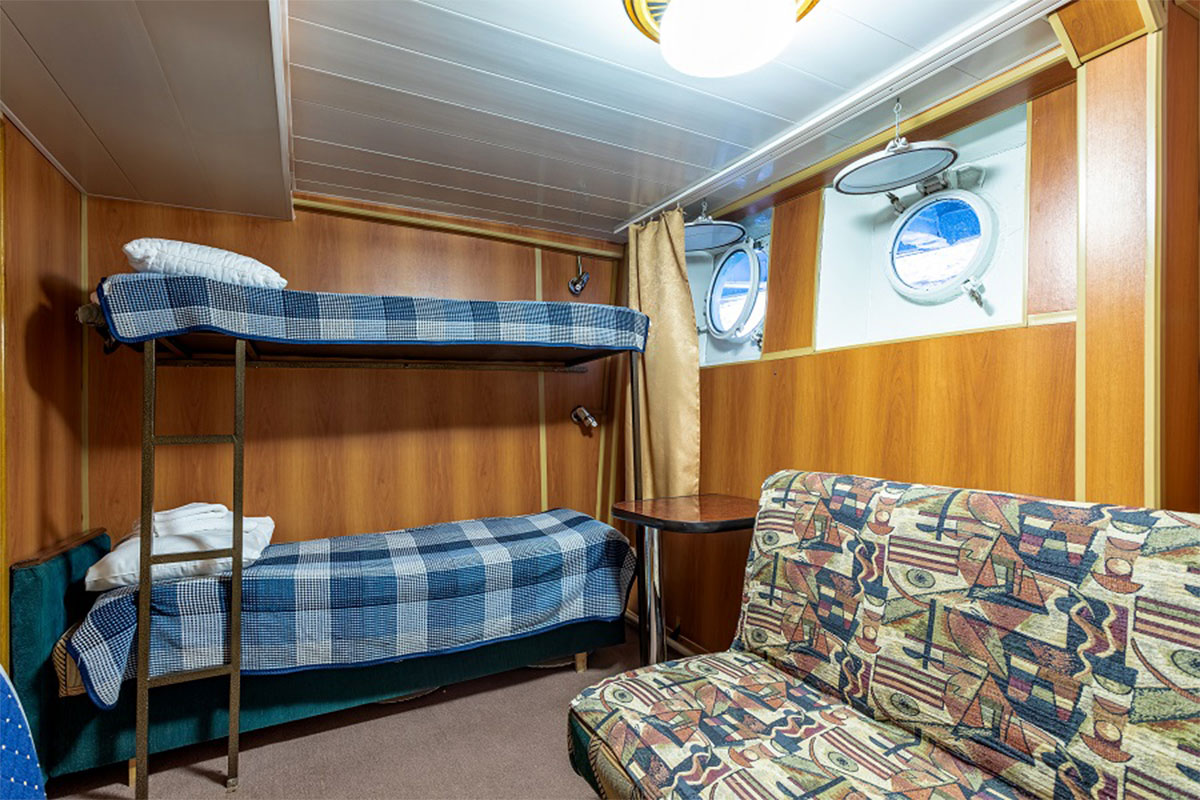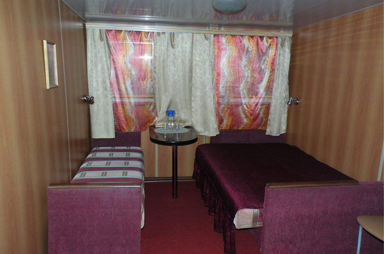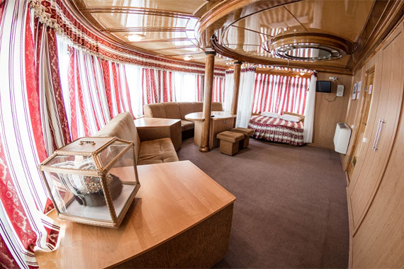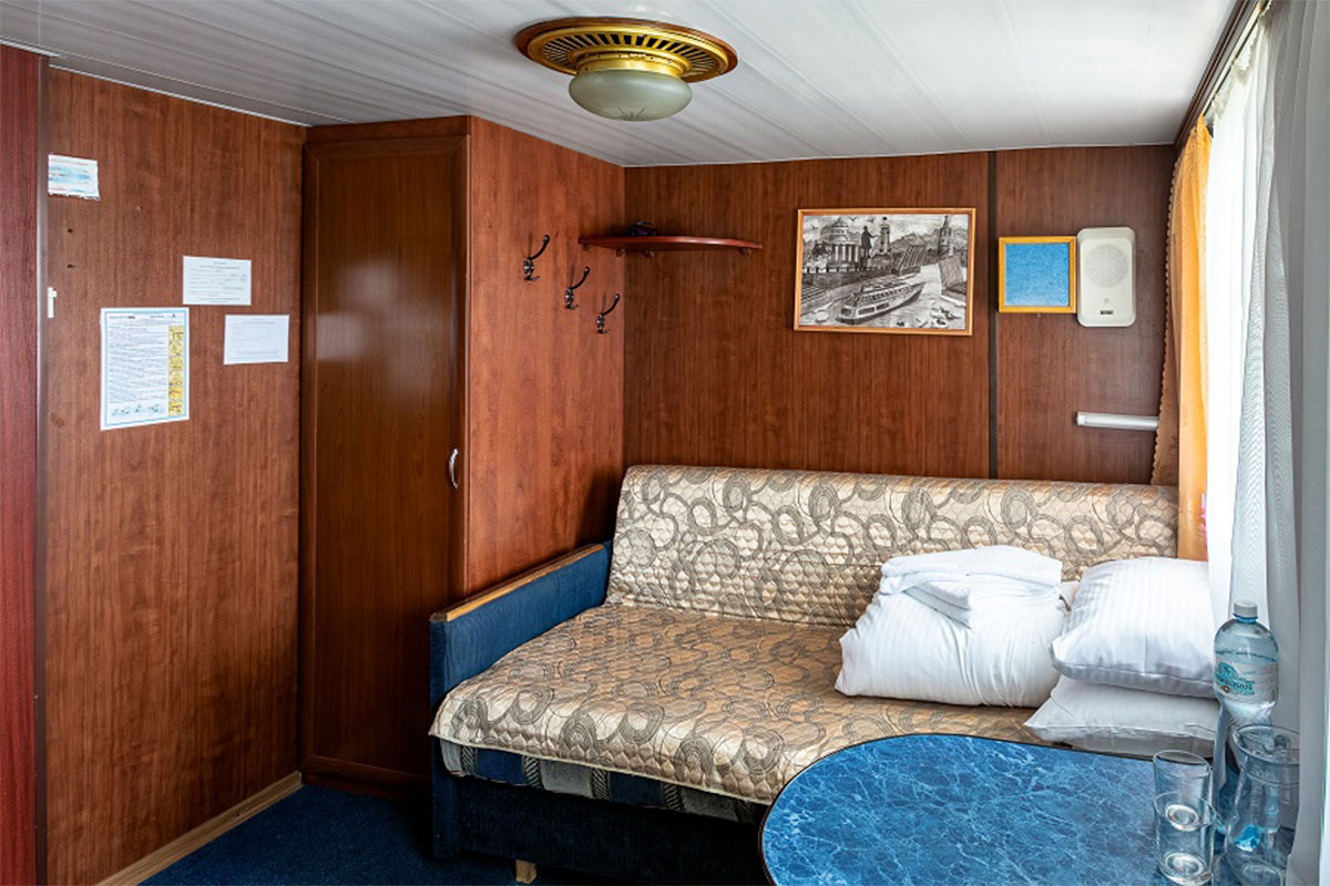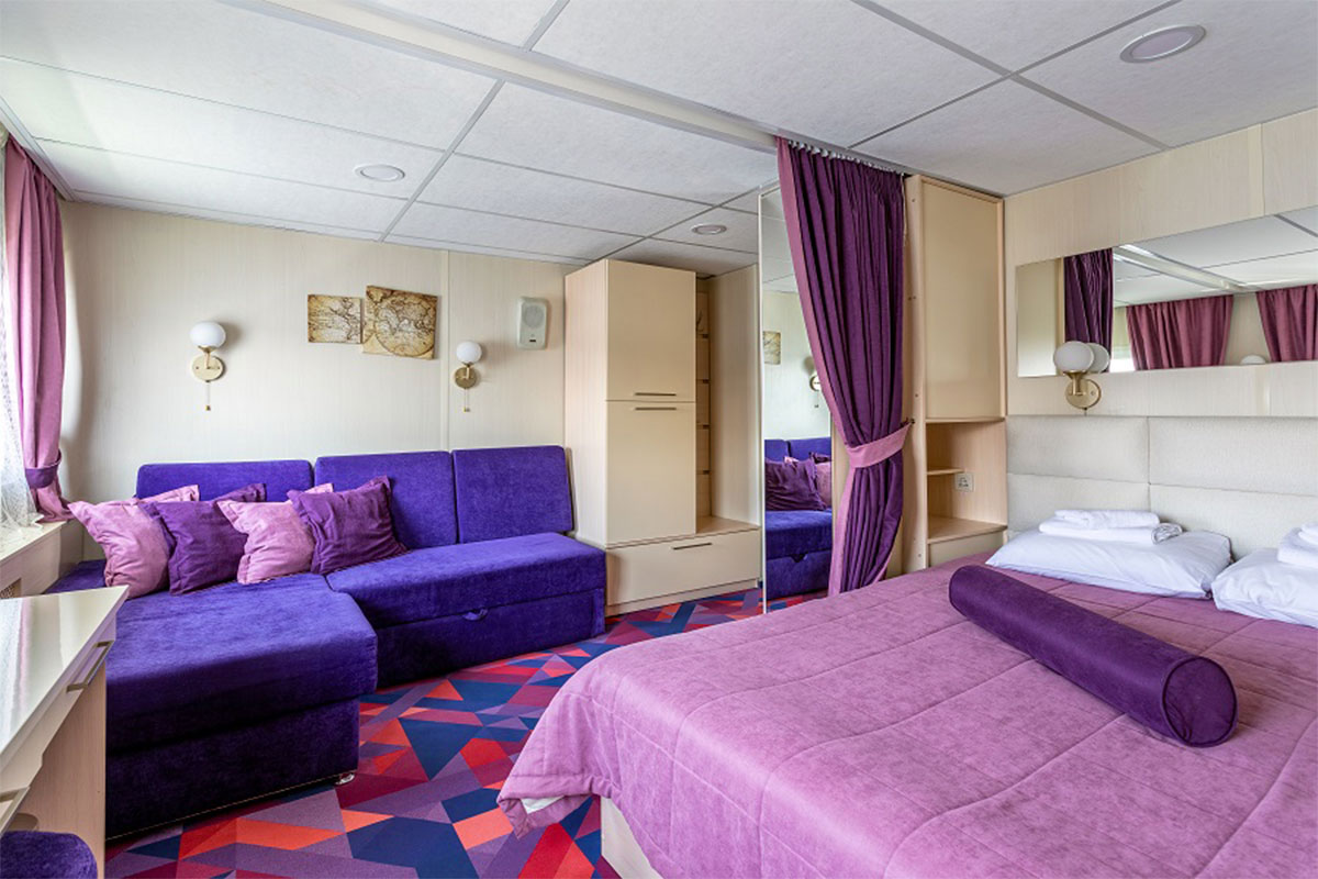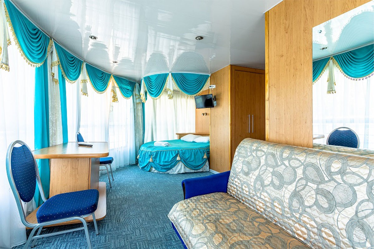 Двухместная каюта увеличенной площади со всеми удобствами, расположенная на шлюпочной палубе. В каюте: двуспальный диван, односпальный диван, шкаф, стол, холодильник, ванная комната (раковина, душ, туалет), фен, телевизор, общая система вентиляции, обзорные окна.