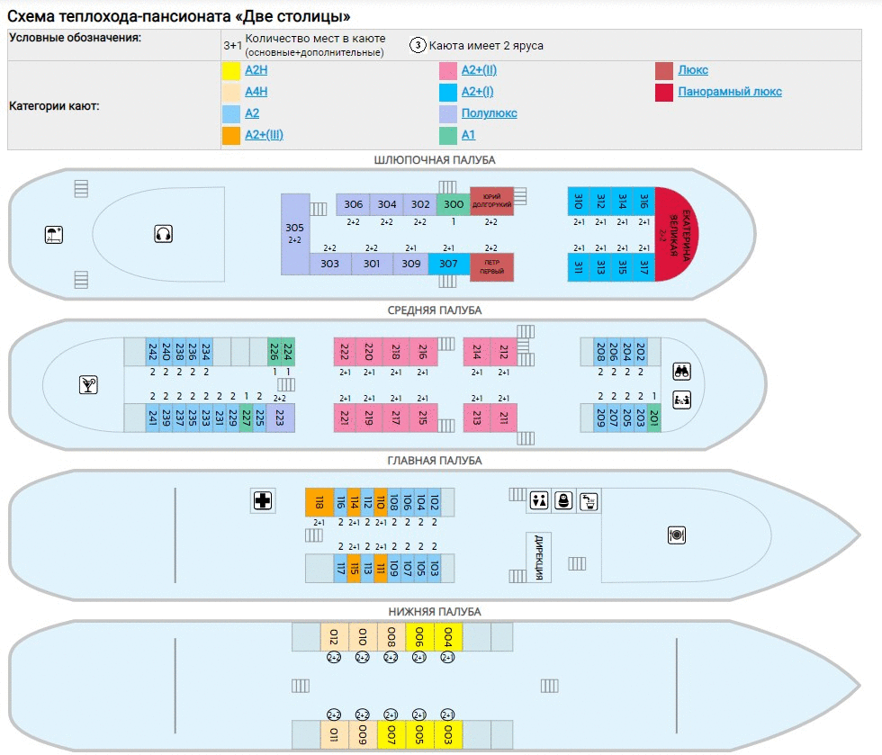 На официальном сайте «Единого центра бронирования речных круизов» можно купить круиз на теплоходе «Две столицы» из Москвы, Санкт-Петербурга и других городов. В навигации 2026 года длительность путешествий составляет от 2 до 15 дней, в том числе круизы выходного дня.