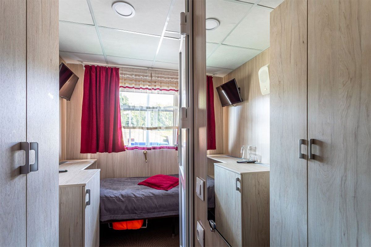 К категории А1 относятся каюты: 201, 224, 226, 227, 300. Одноместная каюта со всеми удобствами, расположенная на средней и шлюпочной палубах. В каюте: односпальная кровать, шкаф, стол, холодильник, ванная комната (раковина, душ, туалет), фен, телевизор, общая система вентиляции, обзорные окна.