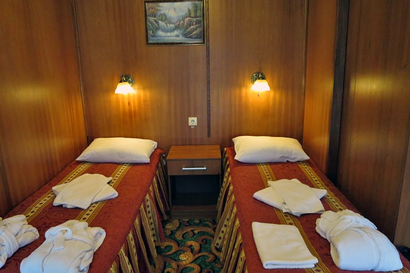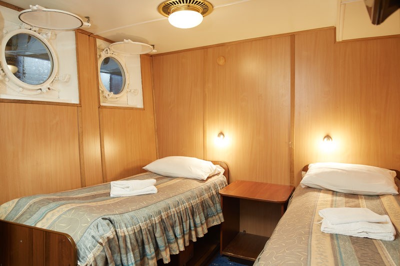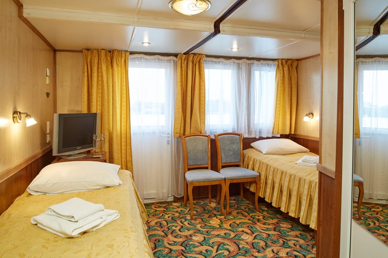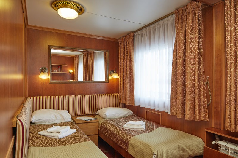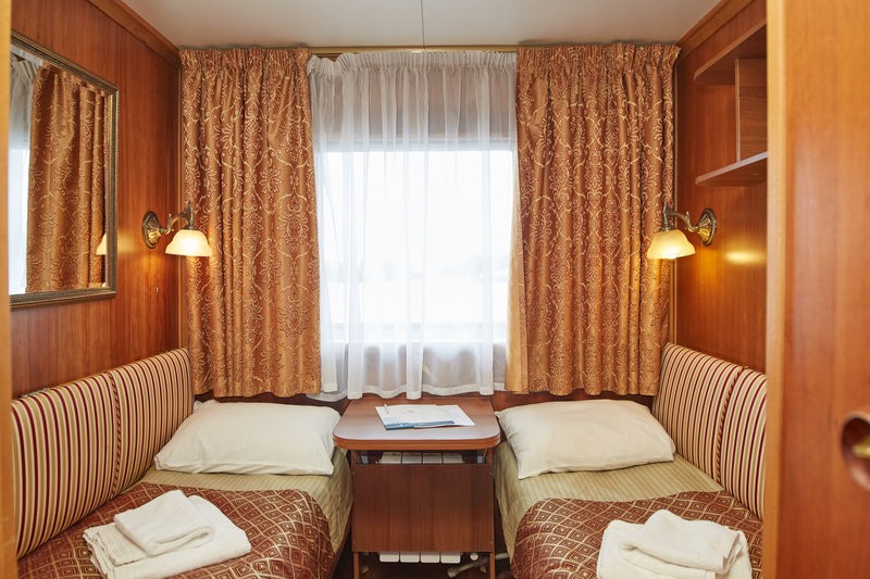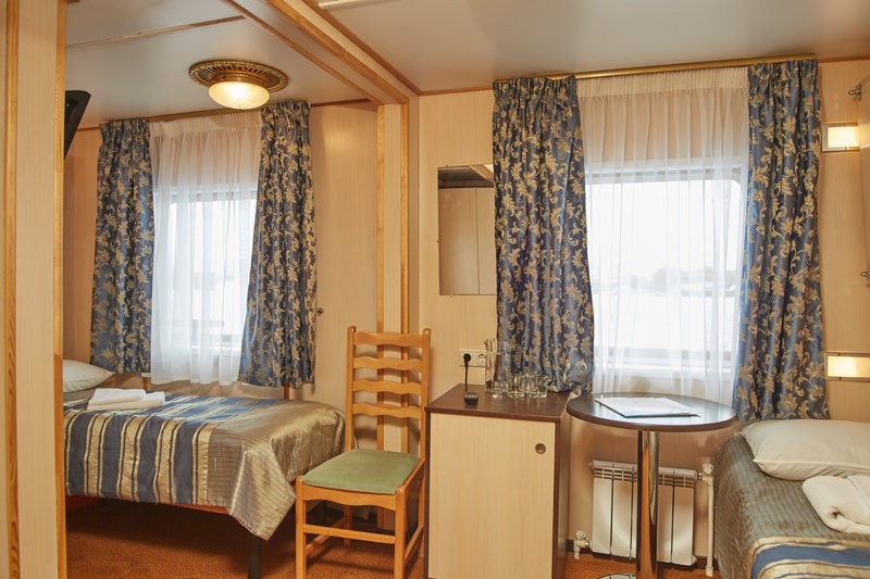 Двухместная одноярусная каюта с дополнительными верхними полками(возможно размещение до 3-х и 4-х человек), расположенная на главной палубе. В каюте: две односпальных кровати и верхние полки, санблок (умывальник, душ, туалет), гигиенический набор (шампунь, гель, шапочка для душа), телевизор, холодильник, регулируемое централизованное кондиционирование, фен, внутренняя телефонная связь.