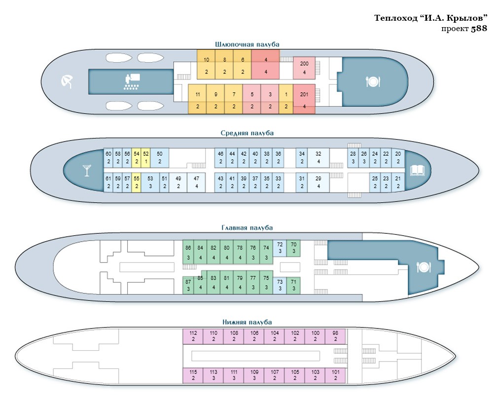 Двухместные каюты: № 20-25, 31, 33-44, 46, 51, 56-60 - расположенные на средней палубе. Трехместные каюты: №26,28 - двухъярусная каюта, расположенная на средней палубе в носовой части теплохода; № 50,72,73- расположенные на средней и главной палубах.