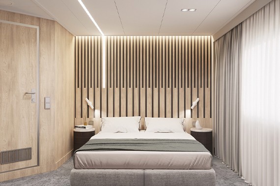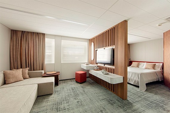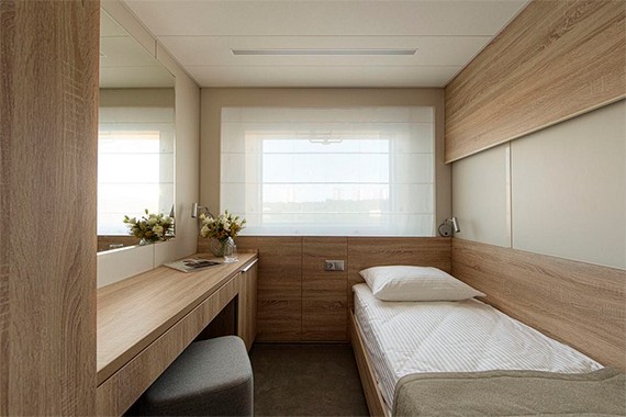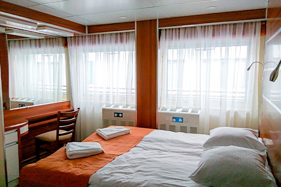 Каюты оборудованы всем необходимым: шкаф для одежды, радио, кондиционер, холодильник, телевизор, фен, душ, сейф, санузел, обзорное окно (или иллюминатор), розетка 220 V, бутилированная вода с ежедневным пополнением, гигиенический набор.