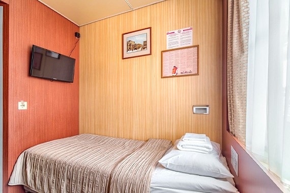 Одноместная каюта со всеми удобствами, расположенная на средней палубе. Площадь каюты ≈ 7,9 м². Размер кроватей – 80х195 см. В каюте: одно спальное место, шкаф для одежды, радио, кондиционер, телевизор, холодильник, фен, сейф, ванная комната (раковина, душ, туалет), розетка 220V, обзорное окно.