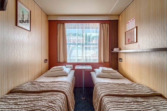 Двухместная каюта со всеми удобствами, расположенная на средней палубе. Площадь каюты ≈ 7,9 м . Размер кроватей - 80х195 см. В каюте: два спальных места (не сдвигаются), ванная комната (раковина, душ, туалет), шкаф для одежды, радио, кондиционер, телевизор, холодильник, фен, сейф, розетка 220V, обзорное окно.