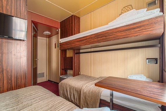 Трехместная двухъярусная каюта со всеми удобствами, расположенная на главной палубе. Площадь каюты ≈ 7,9 м². Размер кроватей: нижние – 80х195 см, верхние – 80х200 см. В каюте: три спальных места (не сдвигаются), шкаф для одежды, радио, телевизор, холодильник, фен, сейф, кондиционер, ванная комната (раковина, душ, туалет), розетка 220V, обзорное окно.