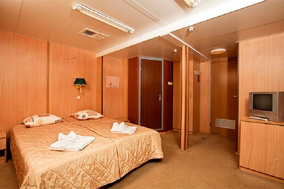 Двухместная каюта со всеми удобствами, расположенная на шлюпочной палубе. Площадь каюты ≈ 17 м . Размер кровати - 175х210 см. В каюте: двуспальная кровать (можно раздвинуть), диван (раскладывается), ванная комната (раковина, душ, туалет), кондиционер, телевизор, сейф, радио, прикроватные тумбы, письменный стол, книжный стеллаж, холодильник, журнальный столик, пуф, шкаф для одежды, мини-бар, 4 розетки на 220V, две розетки USB, фен, обзорное окно.