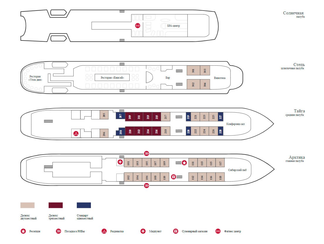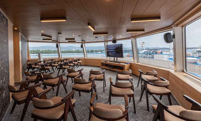 Туристы могут посетить сауну и хамам, расслабиться в массажном кабинете или спа-зоне на солнечной палубе, побывать в соляной комнате. Ежедневная развлекательная программа включает в себя концерты живой музыки, лекции, киносеансы. Особое внимание уделено оздоровительной программе — кроме чистого воздуха Сибири и здорового питания пассажиров ожидают занятия фитнесом и йогой с профессиональным инструктором, тренировки в тренажерном зале, фитобар.