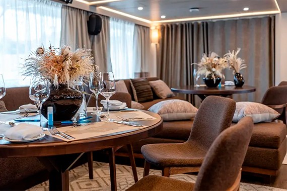 Одну из палуб теплохода полностью занимают рестораны, бары, концертные залы и прочие развлекательные центры. Завтрак и обед сервируются в двух салонах питания по системе шведский стол, ужин заказывается заранее. Ко всем приемам пищи идут бесплатные напитки и настойки. За дополнительную плату туристы могут посетить специальный ужин, на котором отведают свежеприготовленную рыбу и многие другие деликатесы.