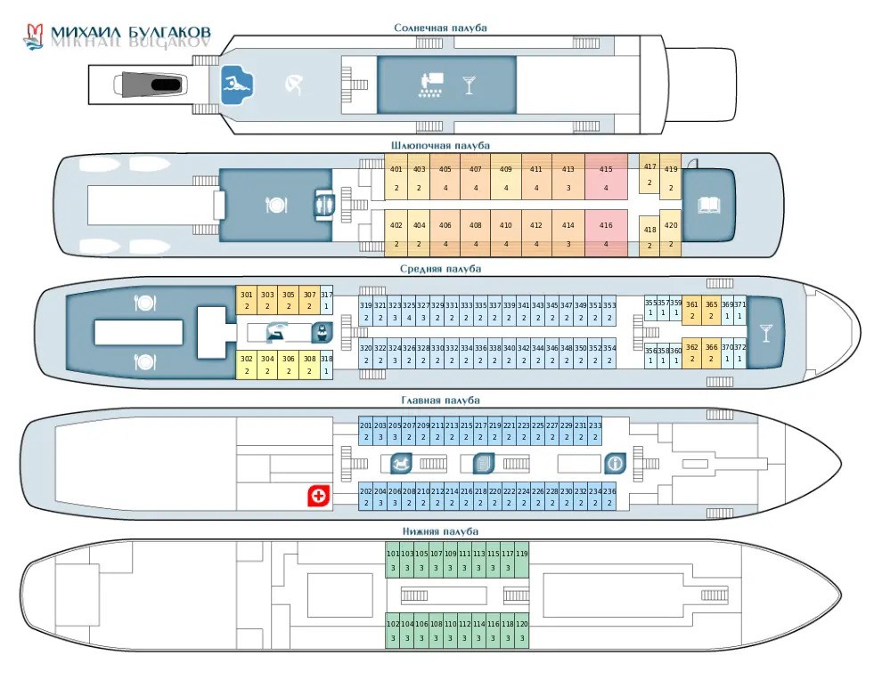 В каждой каюте есть душ, туалет, кондиционер, холодильник, шкаф, телевизор, фен, радиоточка, электрическая розетка 220 В, внутренняя телефонная связь, ROOM-сервис. Подробнее о скидках, акциях, ценах, расписании теплохода «Михаил Булгаков» можно узнать здесь.