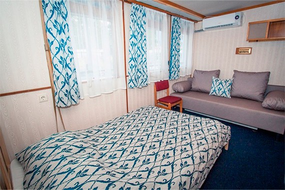 Двухместная каюта со всеми удобствами, расположенная в носовой части средней палубы. Площадь каюты от 6,7 м . Мини-бар за дополнительную плату. В каюте: две односпальные кровати, шкаф для одежды, настенная полка, кондиционер, холодильник, мини-бар, столик, радио, розетка, ванная комната (раковина, душ, туалет), обзорное окно.