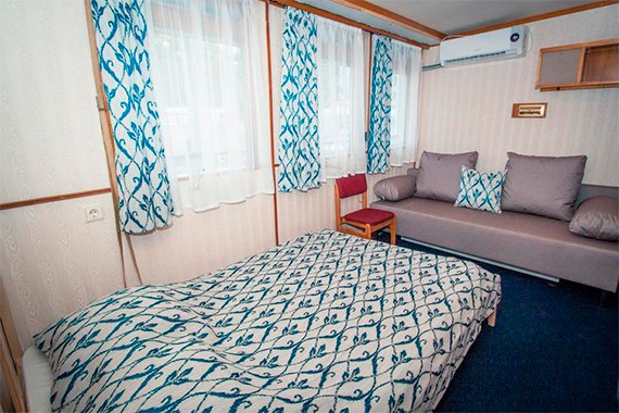Каюты теплохода рассчитаны на одного, двух или четырех человек. Есть апартаменты как эконом-класса, так и уровня «Люкс», где есть большая двуспальная кровать, диван, туалетная комната с душем и все необходимое для комфортного проживания.