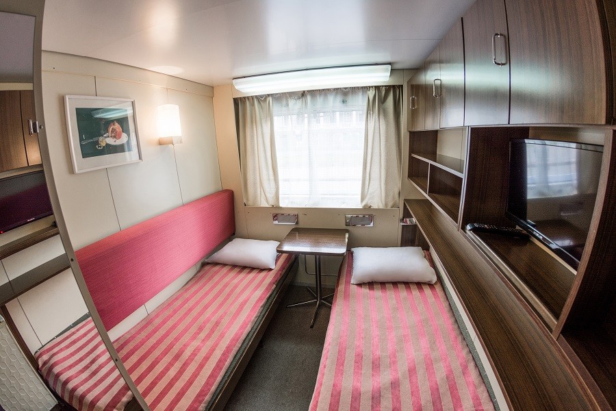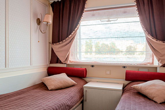 Двухместная каюта со всеми удобствами, расположенная на шлюпочной палубе. В каюте: две односпальные кровати, шкаф, стол, настенная полка, холодильник, ванная комната (раковина, душ, туалет), радио, кондиционер, телевизор с кабельным и спутниковым вещанием, фен, плед для каждого туриста, щетка для одежды, розетки 220 V, обзорное окно.