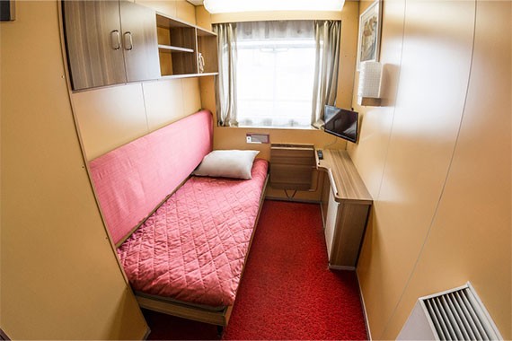 Одноместная каюта со всеми удобствами, расположенная на шлюпочной палубе. В каюте: кровать, шкаф, стол, настенная полка, холодильник, ванная комната (раковина, душ, туалет), радио, кондиционер, телевизор с кабельным и спутниковым вещанием, фен, плед, щетка для одежды, розетки 220 V, обзорное окно.