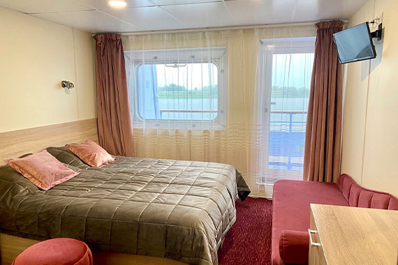 Двухместная каюта увеличенной площади со всеми удобствами, расположенная на шлюпочной палубе. В каюте: одна двуспальная кровать (при необходимости трансформируется в две односпальные кровати), дополнительные места (двуспальный диван), шкаф, прикроватные тумбы, туалетный стол, пуф/кресло, вешалка для верхней одежды, холодильник, ванная комната (раковина, душевая кабина, туалет), кондиционер, радио, плед для каждого туриста, сейф, фен, телевизор с кабельным и спутниковым вещанием, щетка для одежды, розетки 220 V, обзорное окно, персональный балкон с мебелью для отдыха.