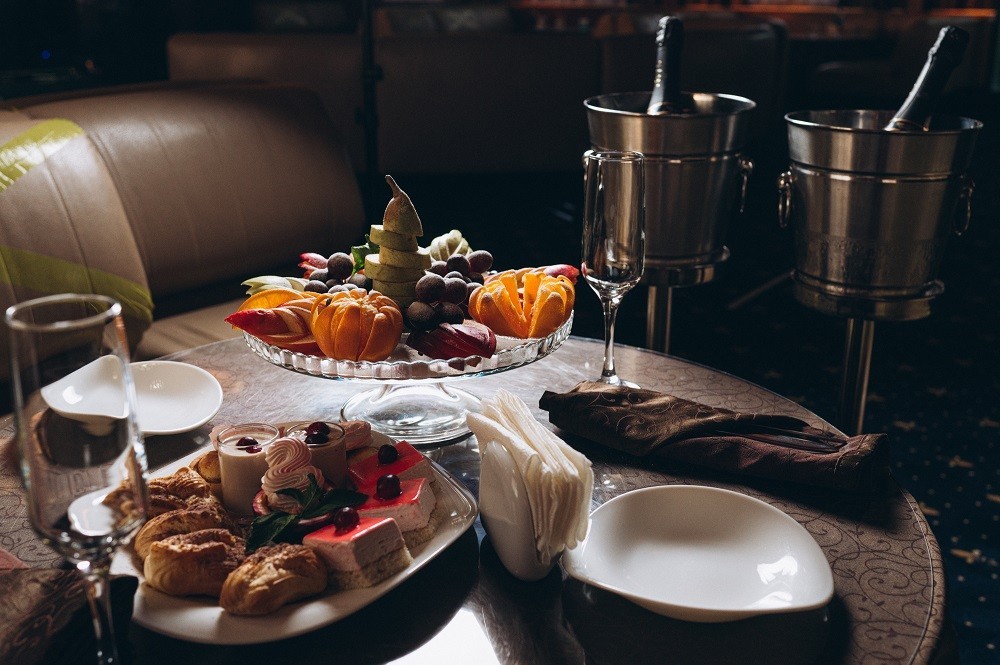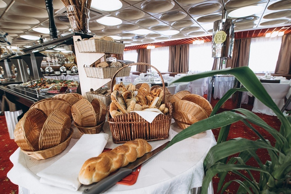 На борту теплохода гостей ждёт трёхразовое питание, включённое в стоимость круиза. Ресторан предлагает разнообразное меню по системе «шведский стол» с выбором вегетарианских и низкокалорийных блюд на завтрак, обед и ужин.
