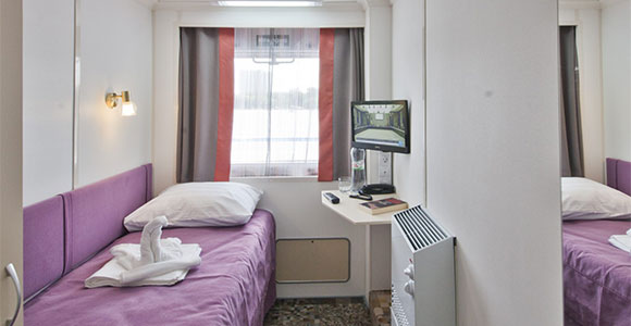 На корабле представлены каюты категорий «Полулюкс» и «Стандарт» на 1, 2 и 4 человек. Они сопоставимы по уровню комфорта с номером в отеле. На странице бронирования можно посмотреть фото и выбрать свободную каюту.