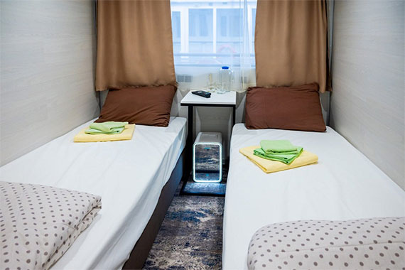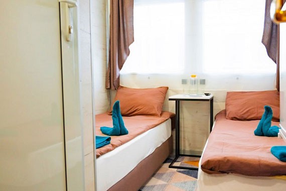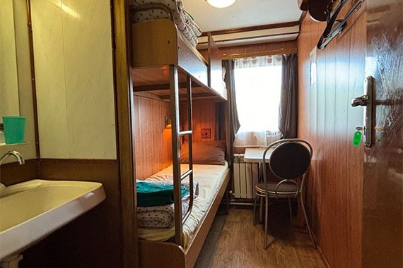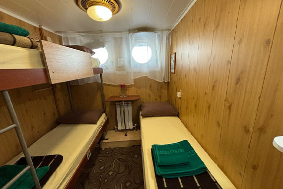 К категории Эконом+ 1+1 (нижняя палуба) относятся каюты: 121-123, 125, 132-135, 142. Двухместная двухъярусная каюта с частичными удобствами, расположенная на нижней палубе. Возможно размещение второго человека на дополнительном месте верхнего расположения. В каюте: двухъярусная кровать, столик, зеркало, раковина, вешалка для верхней одежды, иллюминатор.