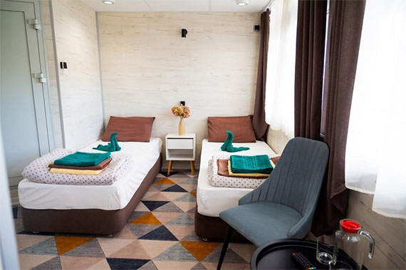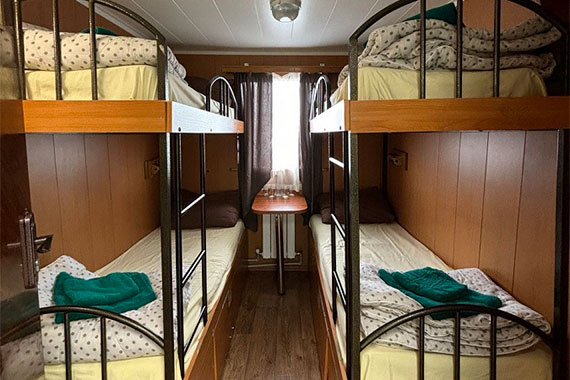 Да, на борту теплохода имеются каюты «Эконом», «Стандарт» и Полулюкс» для размещения 3-4 человека.