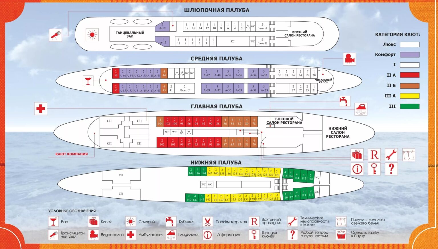 К категории Люкс относятся каюты: А, В. Двухкомнатная двухместная каюта со всеми удобствами, расположенная на шлюпочной палубе. Возможно размещение третьего и четвертого человека на дополнительных местах - спальный диван. В каюте: две односпальные кровати, спальный диван, ванная комната (раковина, душ, туалет), шкаф для одежды, столик, фен, кондиционер, холодильник, телевизор, зеркало, туалетные принадлежности, комплект полотенец, обзорные окна.