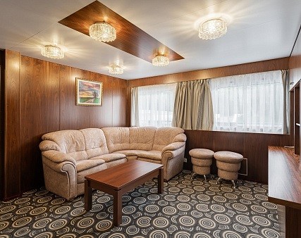 Двухкомнатная каюта с удобствами (душ, санузел, кондиционер). Каюта рассчитана на размещение двух человек (возможно добавить два дополнительных платных места). В гостиной: мягкая мебель (диван), шкафы для одежды, телевизор, холодильник, радио, два обзорных окна, электророзетка на 220V. В спальне: двуспальная кровать, два обзорных окна.